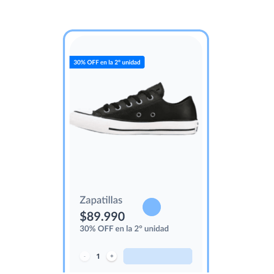 Ofrece un % de descuento en la segunda unidad del mismo producto o dentro de la misma categoría. Puedes limitar la cantidad de usos por producto.